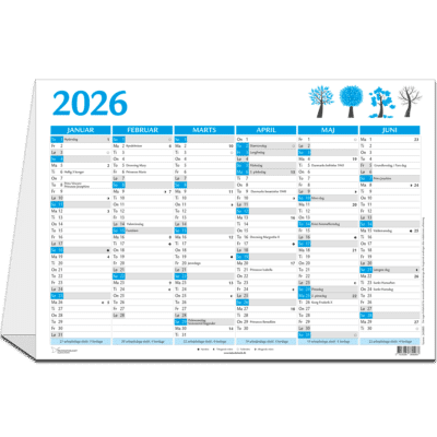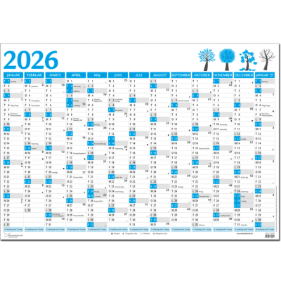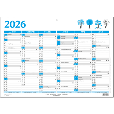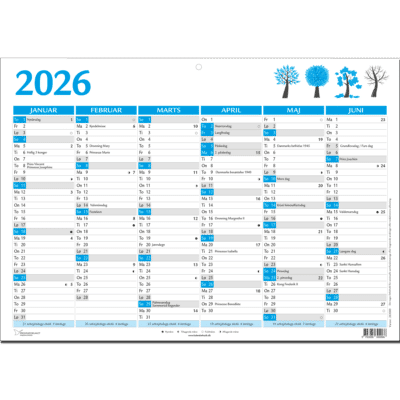 Med en vægkalender har alle i familien mulighed for at få et hurtigt overblik over hele familiens aktiviteter. Vores vægkalendere er både i en udgave med et halvt år på hver side og i en udgave med hele året samlet på en side. Her har du det aktuelle år på den ene side og næste år på den anden side. Begge typer af vægkalendere er selvfølgelig med alle årets helligdage, ugedage, andre vigtige dato informationer samt arbejdsdage hver måned. Derudover er der også angivet, hvor mange lørdage hver måned indeholder. Alt sammen informationer, som er med til at give et nemt overblik over hver måned, uge og dage på året i forhold til planlægning af aktiviteter, ferier og aftaler.