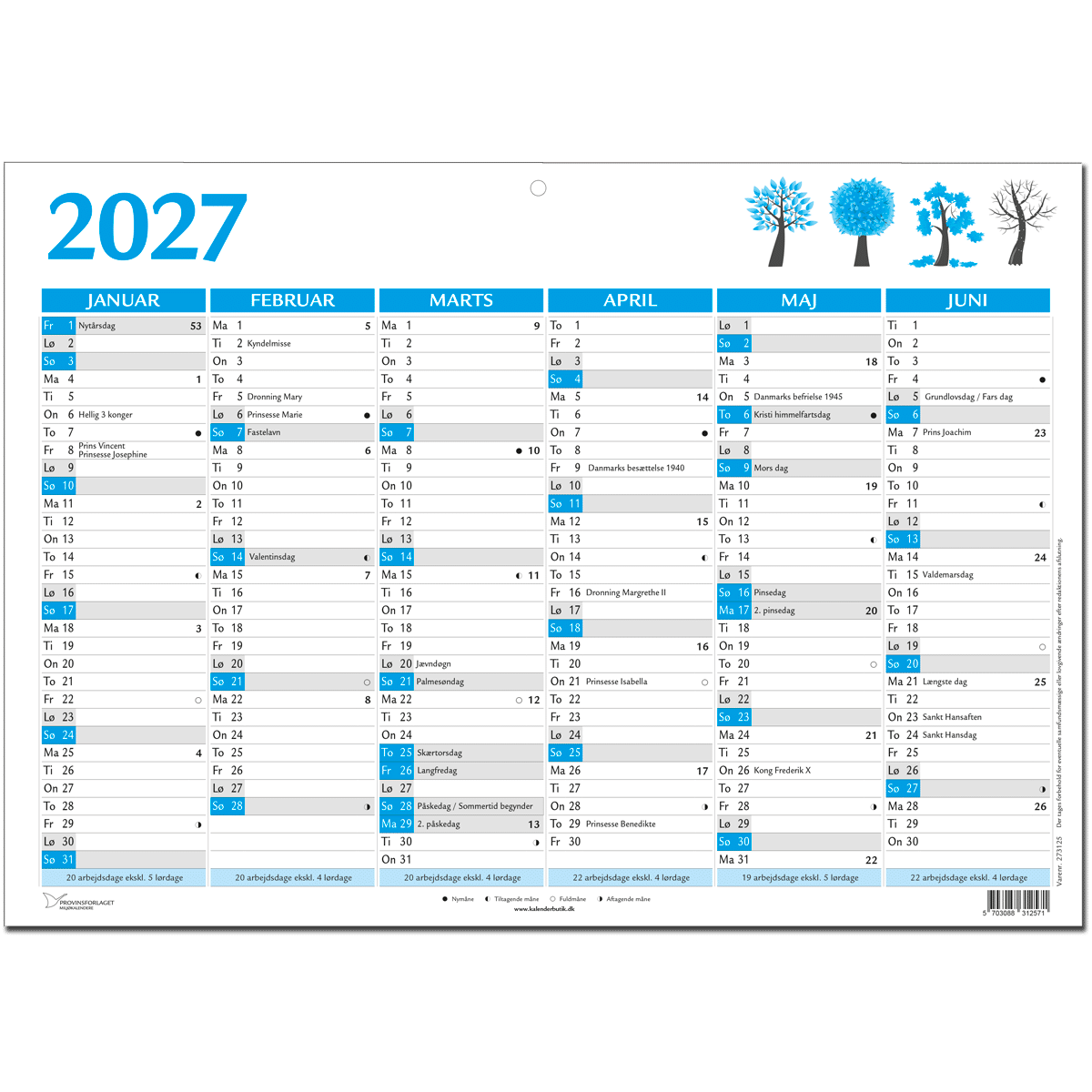 Vores A4 vægkalender i blå er inddelt med 1. halvår af 2027 på den ene side og 2. halvår af 2027 på den anden side.