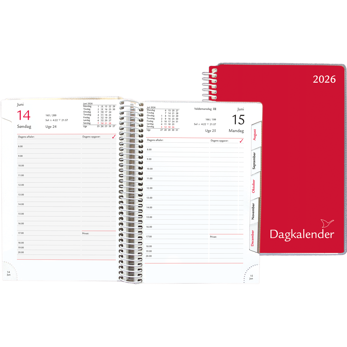 Danmarks mest anvendte kalender. Inddeling til aftaler og opgaver. Timeinddeling fra kl. 8.00-20.00. Med faner og afrivningshjørner. Forrest månedskalendere for indeværende og efterfølgende år, samt infosider med bl.a. postnumre, særtjenestenumre, forskydelige helligdage, samt oversigt med tlf. og www på færger, fly og tog.