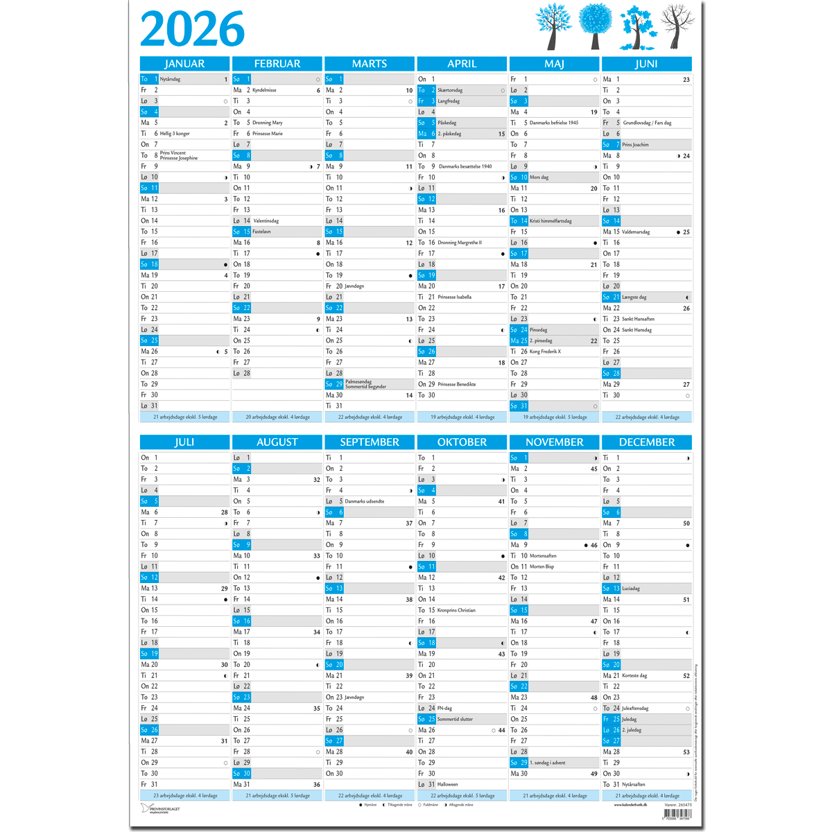 Med det store dobbelt A2-format på 68,0 x 98 cm får du en stor kalender til væg, der giver rigelig skriveplads og et tydeligt årsoverblik. Kalenderen viser både antal arbejdsdage pr. måned og hvor mange lørdage der er i hver måned – ideelt for dig, der arbejder med vagtplaner, projektstyring, produktion, ferieplanlægning eller andre opgaver, hvor langtidsoverblik er vigtigt.