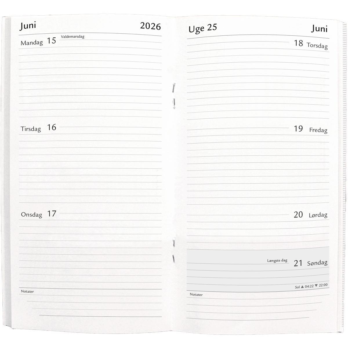 Klammehæftet ugekalender med god skriveplads. Månedsoversigt efterfølgende år samt infosider med praktiske oplysninger. Format: 9,2 x 16,9 cm.