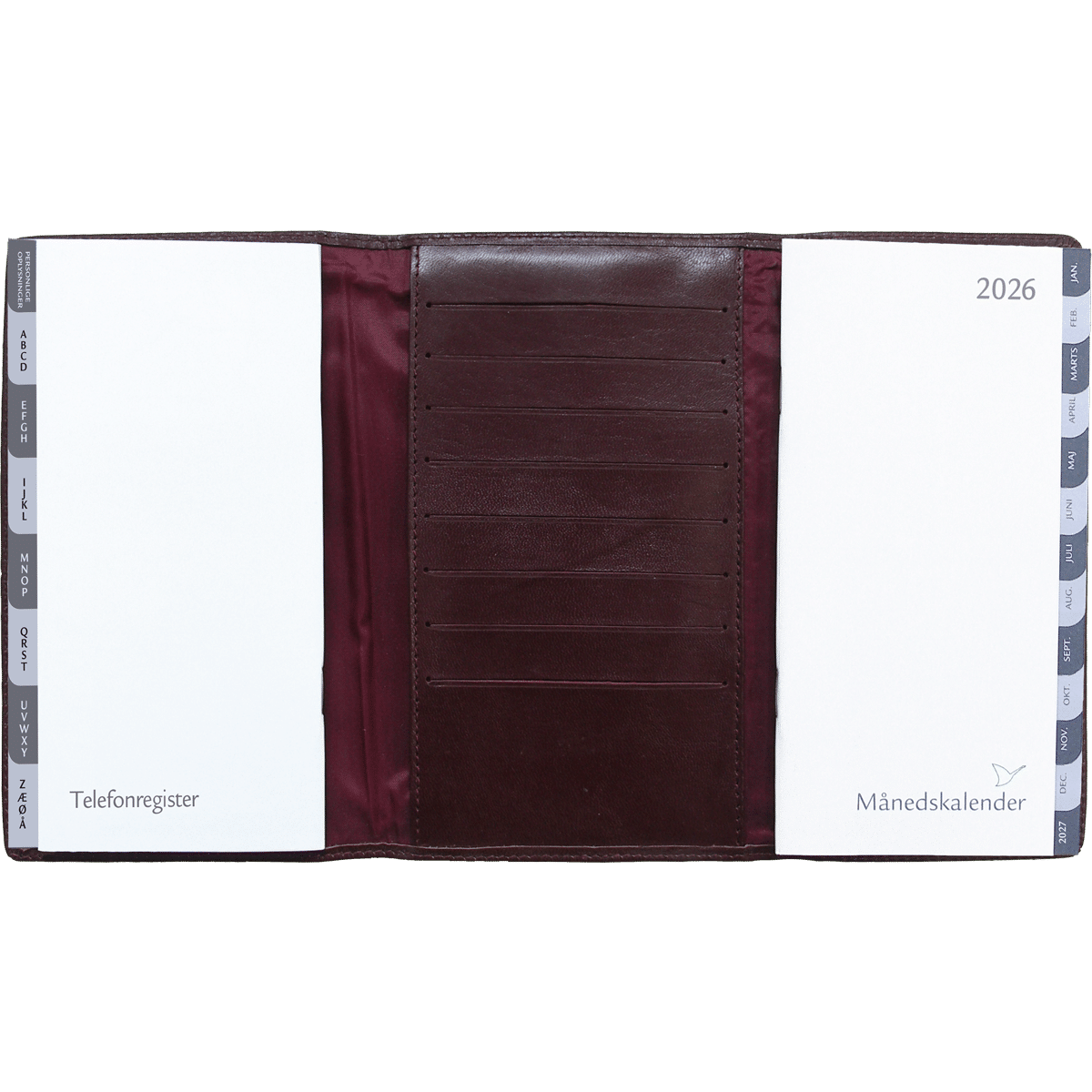 Månedskalenderen er med brunt skinomslag og lige til at have liggende i tasken eller i skuffen.
