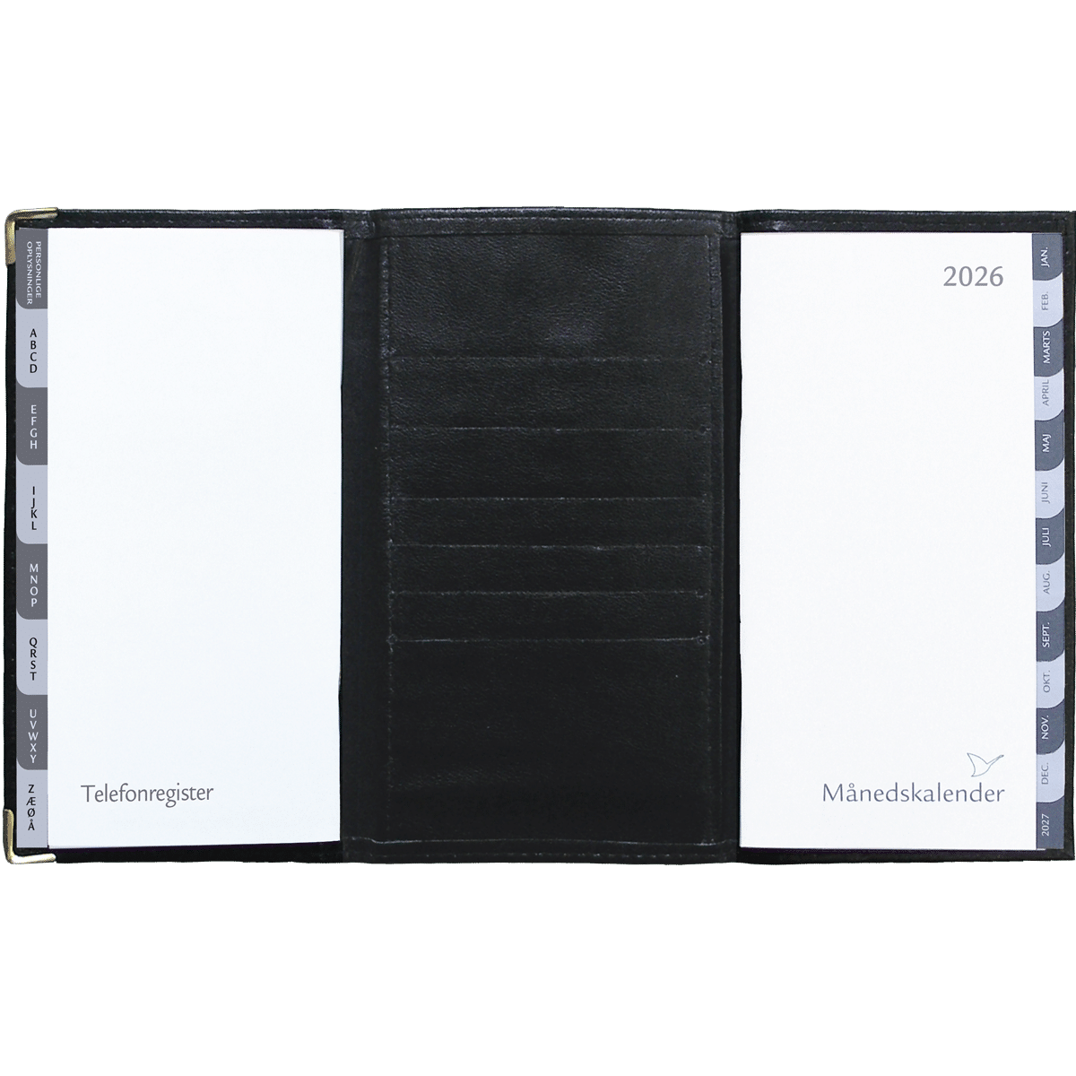Månedskalenderen er med sort kunstlæder og lige til at have liggende i tasken eller i skuffen.