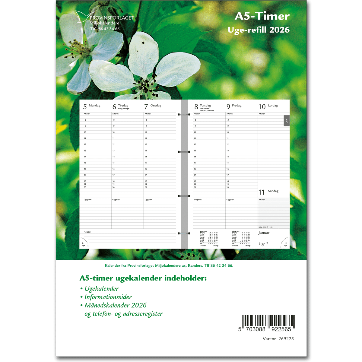 A5 ugekalender refill. Passer til A5 timer omslag. Fire huller i ryggen.