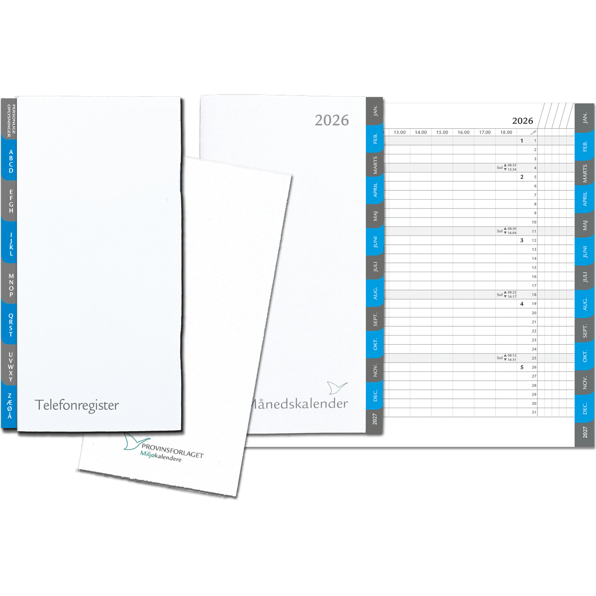 Refillsæt med månedskalender, telefon og adresseregister samt blok. Blå/grå faner