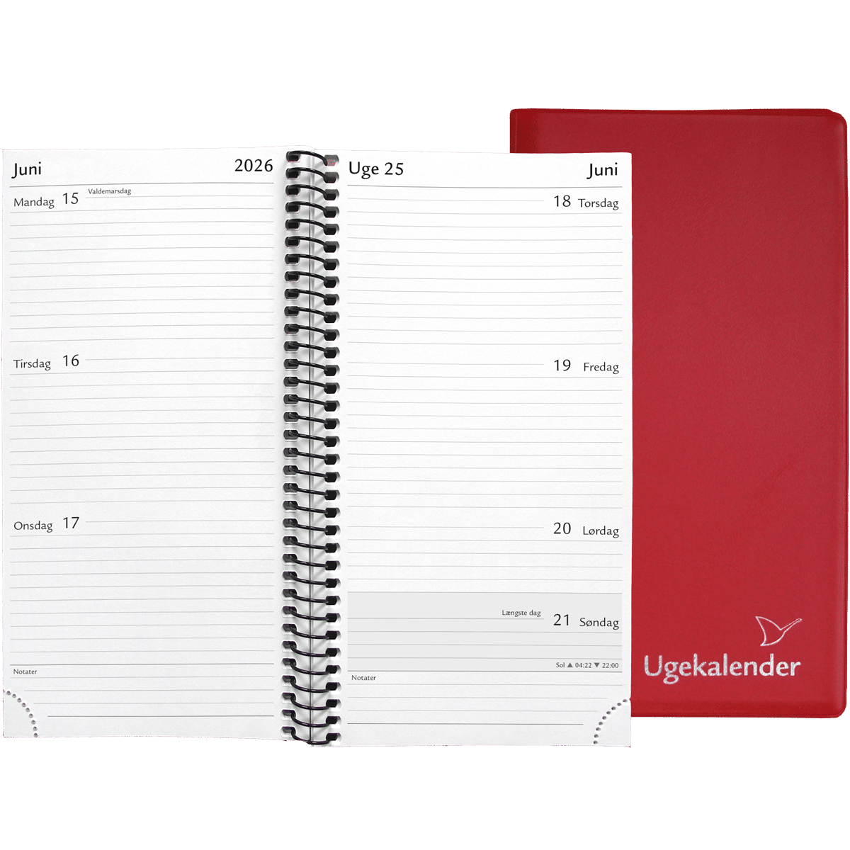 Rødt omslag med spiral ugekalender med god skriveplads. Månedsoversigt efterfølgende år samt infosider med praktiske oplysninger og udfoldningskalender. Format: 10,0 x 17,4 cm.