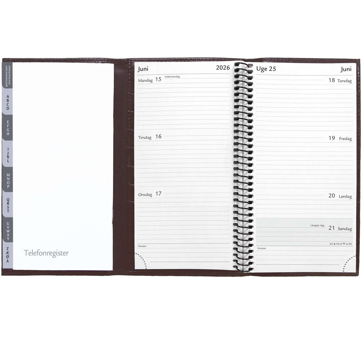 Spiral ugekalender i 3 fløjet skindomslag med blok og telefonregister. Format omslag: 10,5 x 18,2 cm